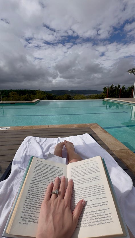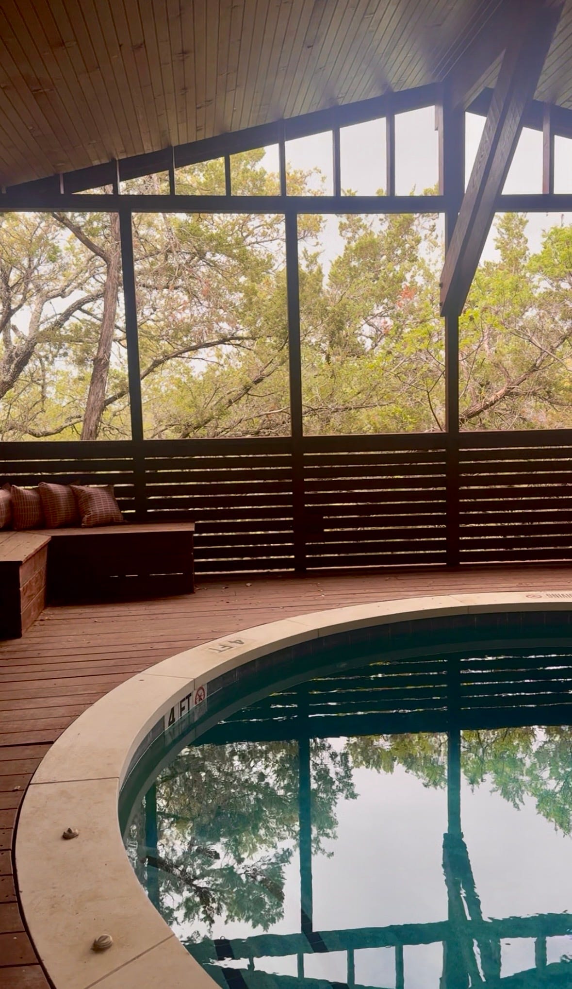 Even if you book no treatments at all, the spa complex itself is worth the trip: steam rooms, a sauna with floor-to-ceiling windows opening onto a private meditation garden, a whirlpool, and the most wonderful quiet room with oversized reading chairs overlooking Lake Travis. I could have spent entire afternoons in that chair alone. The adjacent Serenity Pool — an infinity pool with lounge seating overlooking the Hill Country, meditative music, and access directly from the spa — is equally wonderful.