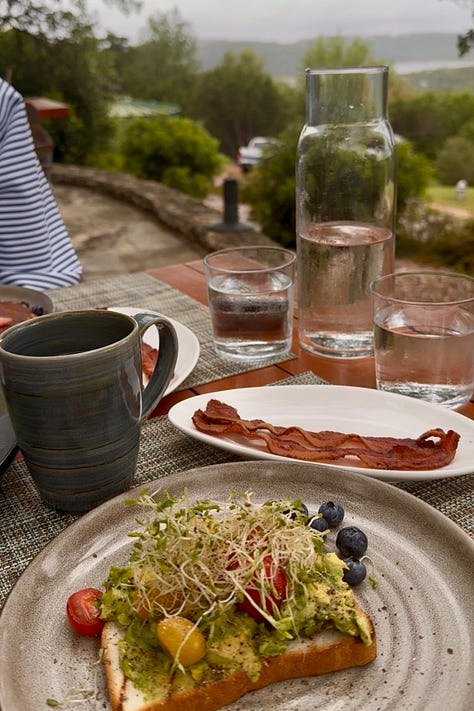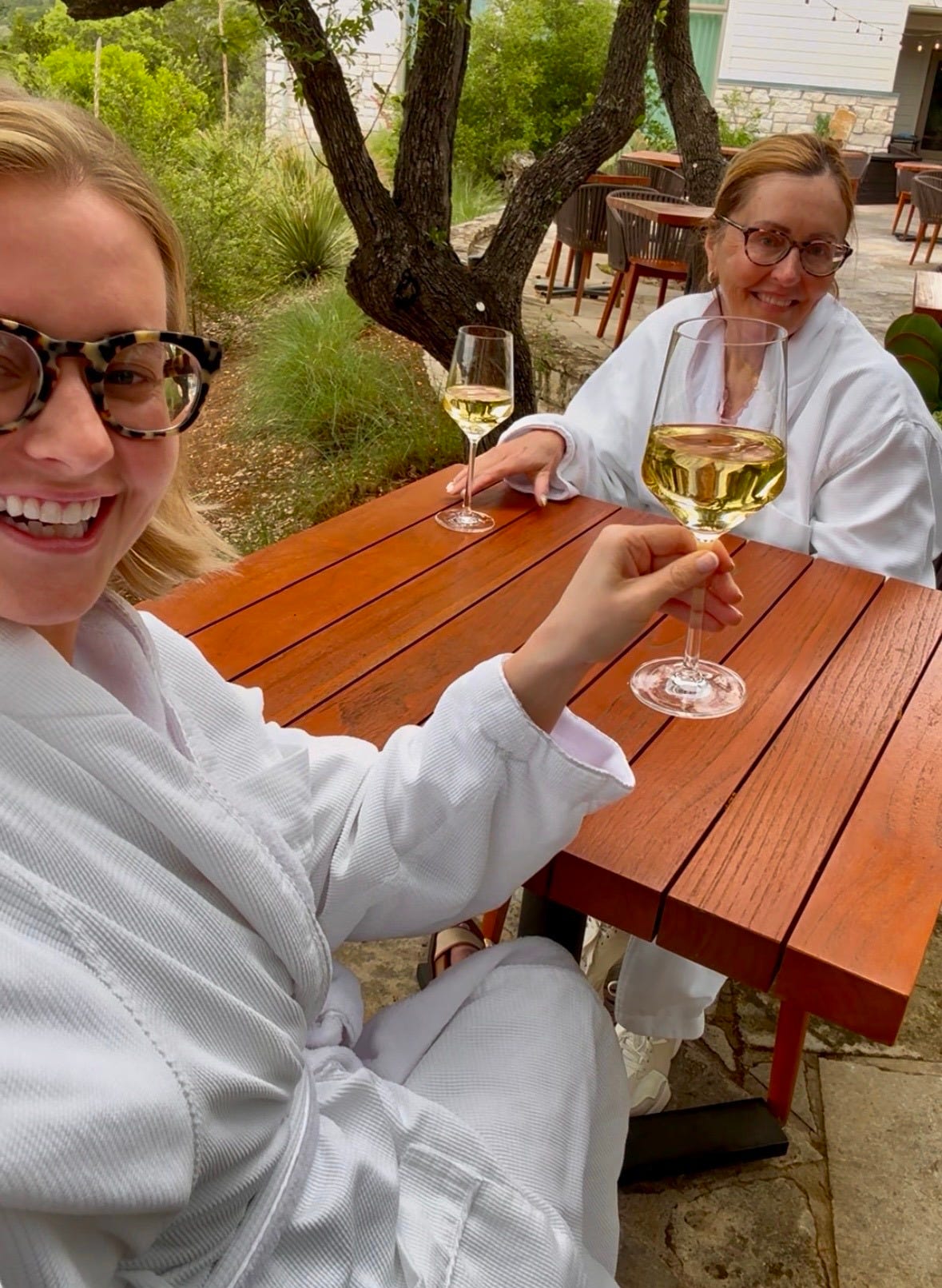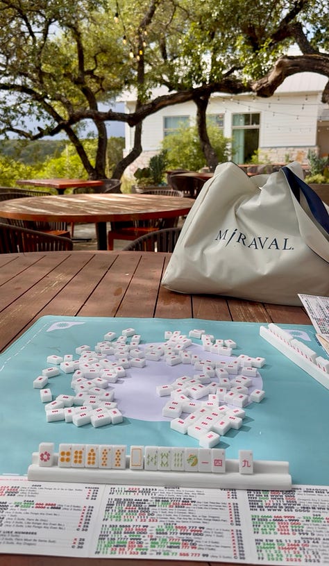 One of the great gifts of Miraval Austin is how much of the experience unfolds outdoors — morning movement, afternoon pool time, al fresco dinners, winding walks between activities. So, yes, temperature matters. Early April gave us high 50s to low 60s in the mornings (ideal for a pre-breakfast walk or stretch class), high 70s in the afternoons (beautiful for pool-side reading or happy hour mahjong sessions), and cool evenings that made robed dinners outside feel like the obvious choice.